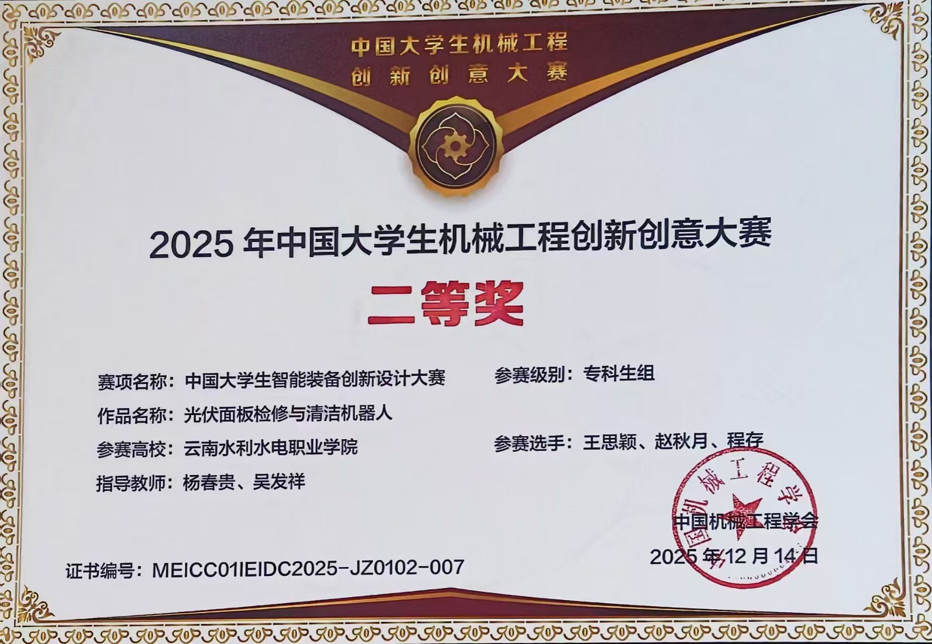 喜报!公司学子斩获2025年中国老员工智能装备创新设计大赛全国二等奖